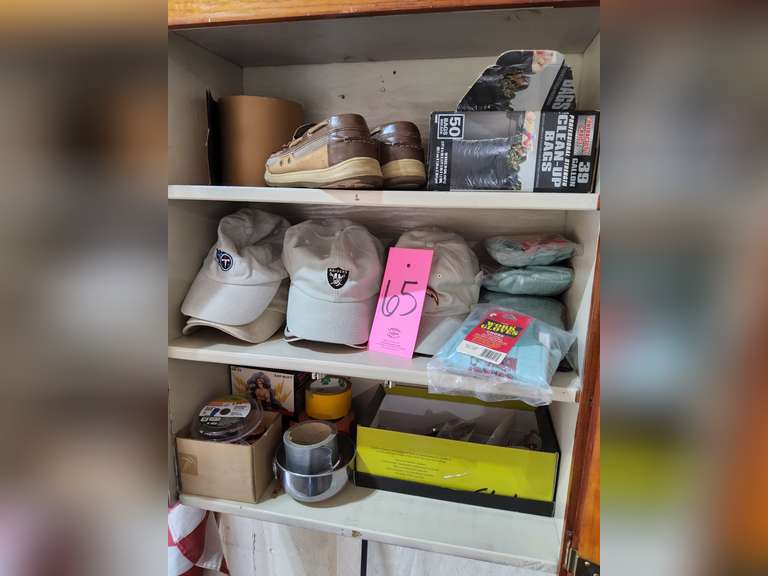 LOT 65 - Group misc: ball caps, new gloves, tape, shoes & other