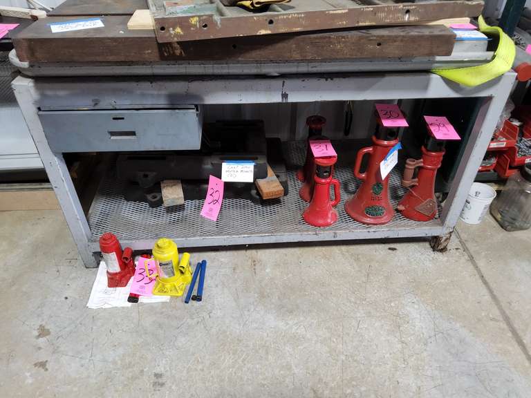 LOT 28 - Cast iron machine table welded steel base (contents ontop & below NOT included) approx 59.5" x 28.5" x 33.5"
