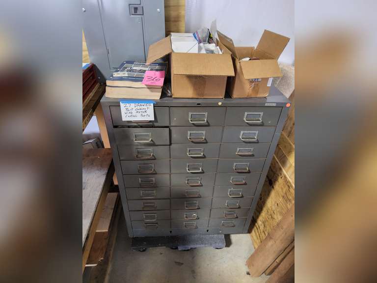 LOT 36 - 27 drawer parts cabinet WITH CONTENTS (motor control parts) & other on top, with 2 small dollies